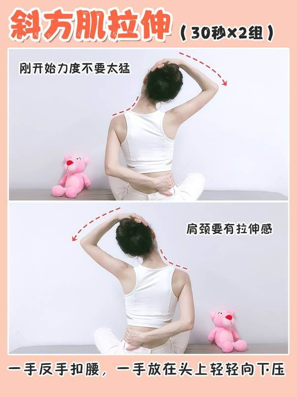 左手往後向後扣住腰部,另一隻手放在頭上輕輕向下拉,此時男士頭部會感覺到輕微的拉扯感,約20秒之後轉換另一隻手,做同樣的動作。